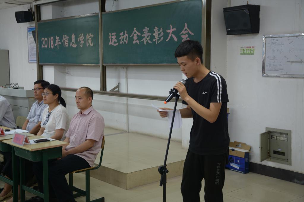团总支副书记曾珊宣读受表彰人员名单,颁奖嘉宾为获奖人员颁奖。优秀教练员苏通、优秀运动员代表郭华伟、先进工作者代表付俊良、班长代表赵旭辉相继上台发言。